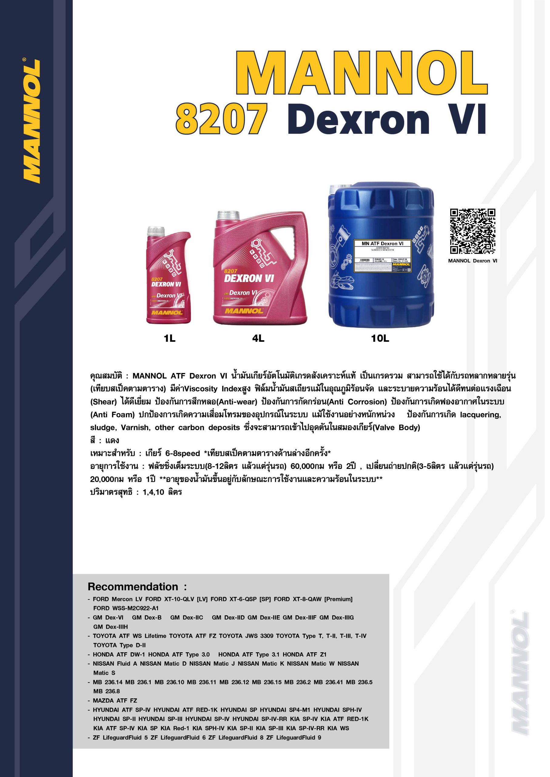 คุณสมบัติ : MANNOL ATF Dexron VI น้ำมันเกียร์อัตโนมัติเกรดสังเคราะห์แท้ เป็นเกรดรวม สามารถใช้ได้กับรถหลากหลายรุ่น (เทียบสเป็คตามตาราง) มีค่า Viscosity Indexสูง ฟิล์มน้ำมันเสถียรแม้ในอุณภูมิร้อนจัดและระบายความร้อนได้ดีทนต่อแรงเฉือน (Shear) ได้ดีเยี่ยม ป้องกันการสึกหรอ (Anti-wear) ป้องกันการกัดกร่อน (Anti Corrosion) ป้องกันการเกิดฟองอากาศในระบบ(Anti Foam) ปกป้องการเกิดความเสื่อมโทรมของอุปกรณ์ไนระบบ แม้ใช้งานอย่างหนักหน่วง ป้องกันการเกิด Iacquering,sludge, Varnish, other carbon deposits ซึ่งจะสามารถเข้าไปอุดตันในสมองเกียร์ (Valve Body)