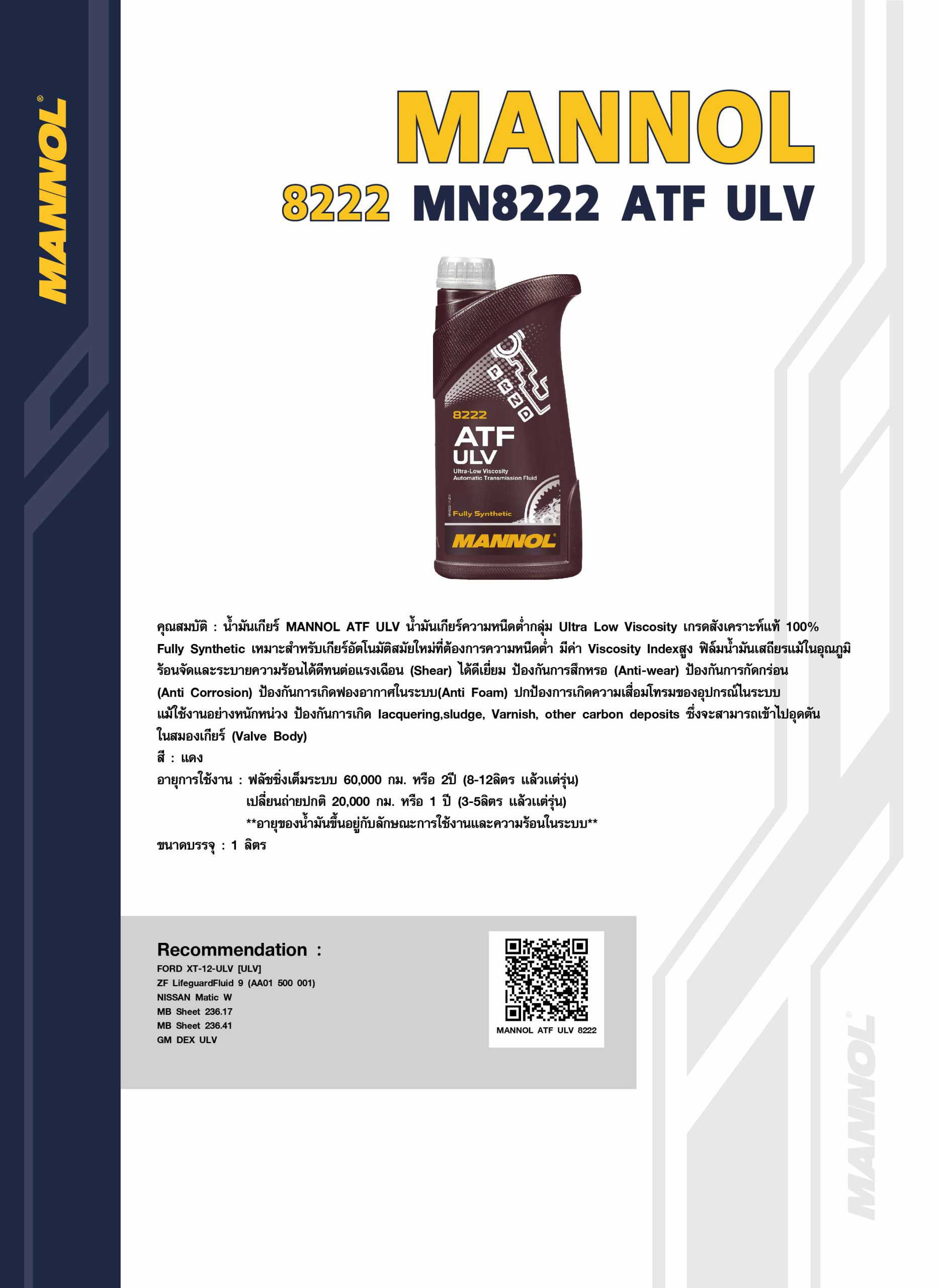 คุณสมบัติ : น้ำมันเกียร์ MANNOL ATF ULV น้ำมันเกียร์ความหนืดต่ำกลุ่ม Ultra Low Viscosity เกรดสังเคราะห์แท้ 100% Fully Synthetic เหมาะสำหรับเกียร์อัตโนมัติสมัยใหม่ที่ต้องการความหนืดต่ำ มีค่า Viscosity Indexสูง ฟิล์มน้ำมันเสถียรแม้ในอุณภูมิ ร้อนจัดและระบายความร้อนได้ดีทนต่อแรงเฉือน (Shear) ได้ดีเยี่ยม ป้องกันการสึกหรอ (Anti-wear) ป้องกันการกัดกร่อน (Anti Corrosion) ป้องกันการเกิดฟองอากาศในระบบ (Anti Foam) ปกป้องการเกิดความเสื่อมโทรมของอุปกรณ์ในระบบ แม้ใช้งานอย่างหนักหน่วง ป้องกันการเกิด lacquering, sludge, Varnish, other carbon deposits ซึ่งจะสามารถเข้าไปอุดตัน ในสมองเกียร์ (Valve Body)
